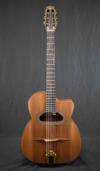 vendue Florian Jégu Alla Busato avec étui Table red cedar, fond et éclisses ziricote, manche noyer. |