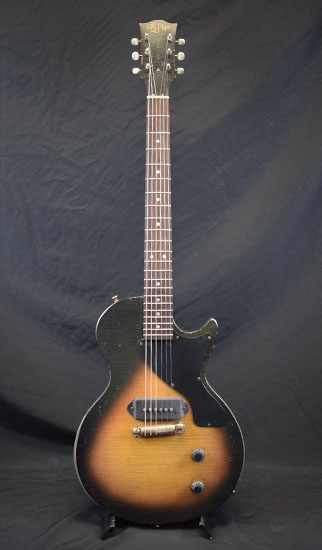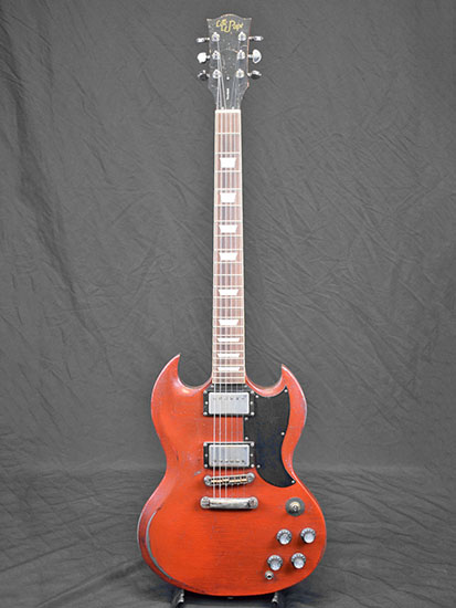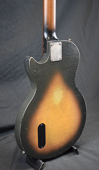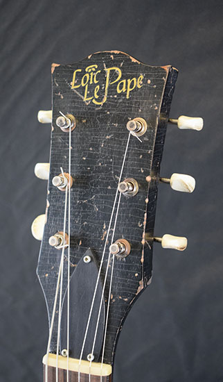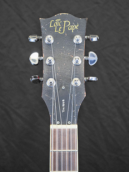 | vendue Loïc Le Pape 1949 Old Copper L'aboutissement ultime du design de Loïc, un hybride rare et pourtant très réussi entre une J-160E, un banjo et une ES-125. La 1949 reprend le look à double pickguard d'une J-185 Everly Brothers, le petit micro simple au pied du manche avant la rosace d'une J-160E (l'acoustique des Beatles !), et les allie à un micro piezo. À vide, le son n'est pas fort mais il est très flatteur et plein, bien plus qu'une solidbody habituelle. Branché sur un ampli acoustique, on jurerait une électro traditionnelle. Branché sur un ampli électrique avec le piezo, le rendu nasillard permis par l'EQ embarquée très efficace ferait croire à un banjo ou un sitar. Et enfin, le micro magnétique sur un ampli électrique nous ramène vers le territoire de la 1940 Candy. Un nouvel hybride ? Absolument, et pas des moindres. |